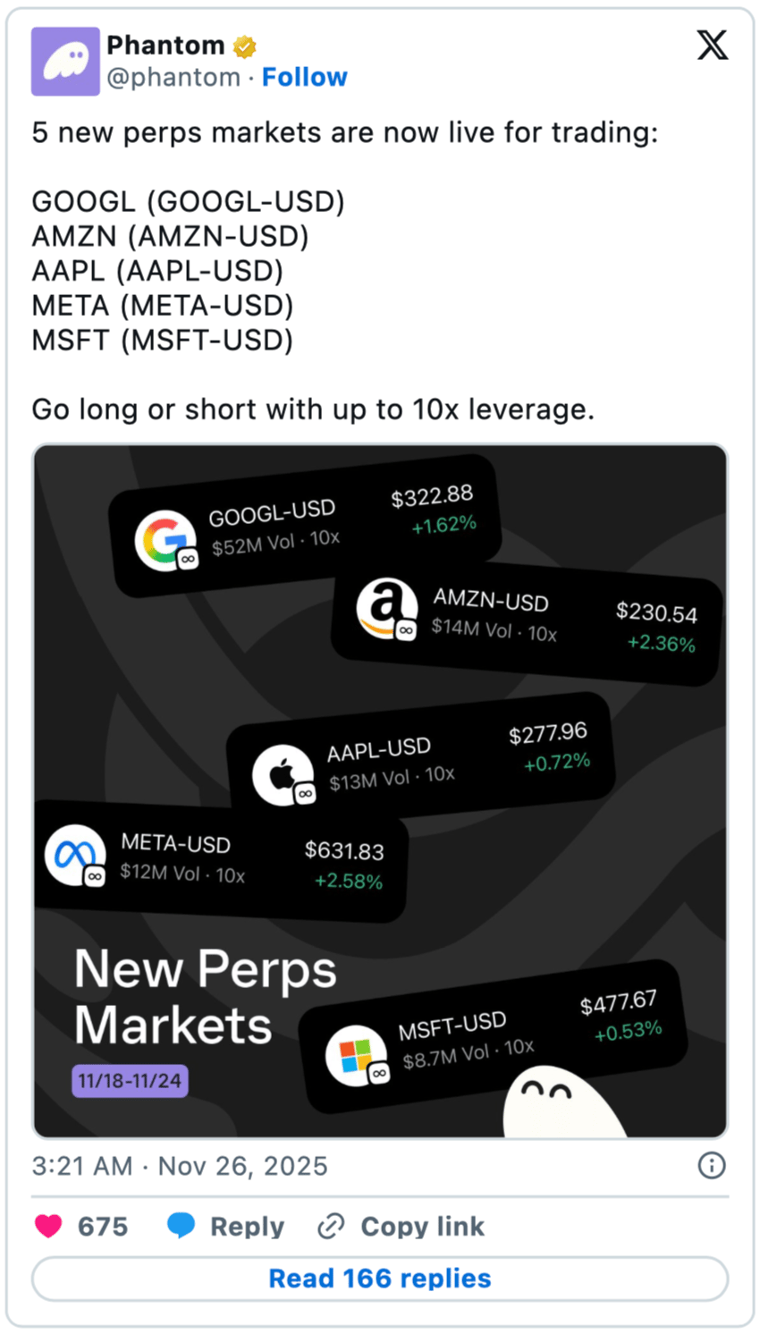 Perpetual futures for some of the most-traded equities just landed on Phantom. You can now trade crypto and stocks side-by-side on the same self-custodial platform, which is basically the Holy Grail of retail investing. Add Phantom Cash, a new stablecoin suite, and you’re looking at the early innings of an everything app.