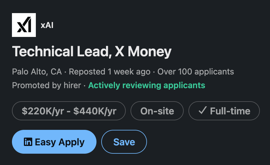 𝕏 Money: According to a recent job posting, Elon Musk's 𝕏 is moving to accelerate development of a new payments platform. The language of the posting indicates a potential openness to blockchain infrastructure, with stablecoin rails as a possible foundation for the stack. While the firm has offered no public roadmap, the hire underscores 𝕏’s intent to compress build times and push deeper into next-generation digital payments plumbing.