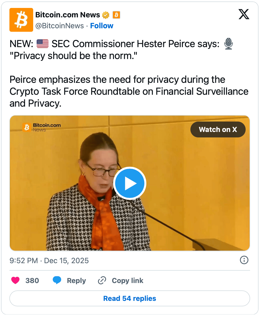 Financial privacy has become one of the most actively debated themes in crypto, making it particularly notable to see SEC Commissioner Hester Peirce emerge as a clear and principled advocate for it, lending institutional weight to the conversation.