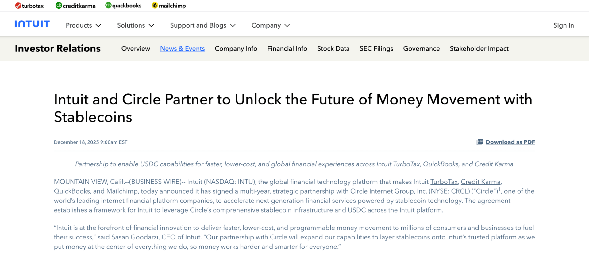 Stablecoin Capabilities: Intuit has partnered with Circle to integrate stablecoin capabilities across its products including TurboTax, QuickBooks, and Credit Karma. Under a multi-year agreement, Intuit will use Circle’s infrastructure and USDC to support faster and more programmable transactions.